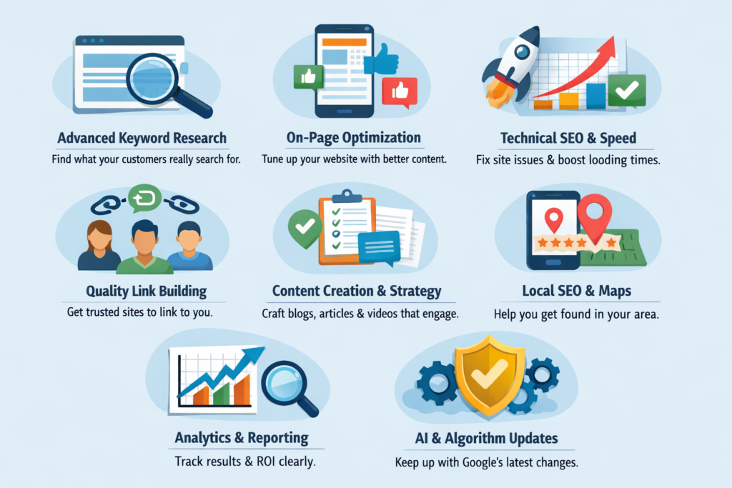 SEO services for small businesses in 2026 are no longer just about keywords and blog posts. They encompass technical health, content quality, AI search visibility, local presence, link authority, and transparent reporting.